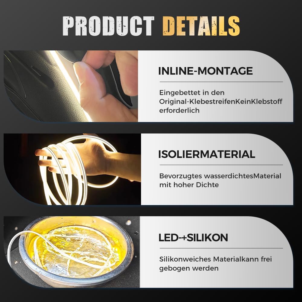 Einfach den Lichtstreifen in die vorhandene Gummidichtung einlegen – kein Werkzeug, keine Verkabelungskomplexität, keine Schäden am Fahrzeug. Das automatische Ein- und Ausschalten macht das Licht besonders praktisch, gerade wenn Sie schwere Taschen tragen oder spät abends Gepäck einladen.