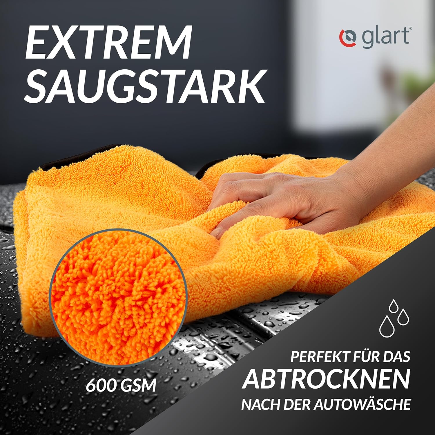 Das Trockentuch ist multifunktional einsetzbar: Autopflege, Glasreinigung, Haushalt, Küche oder Bad. Hergestellt in Deutschland, maschinenwaschbar, pflegeleicht und langlebig.