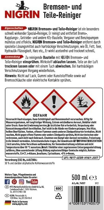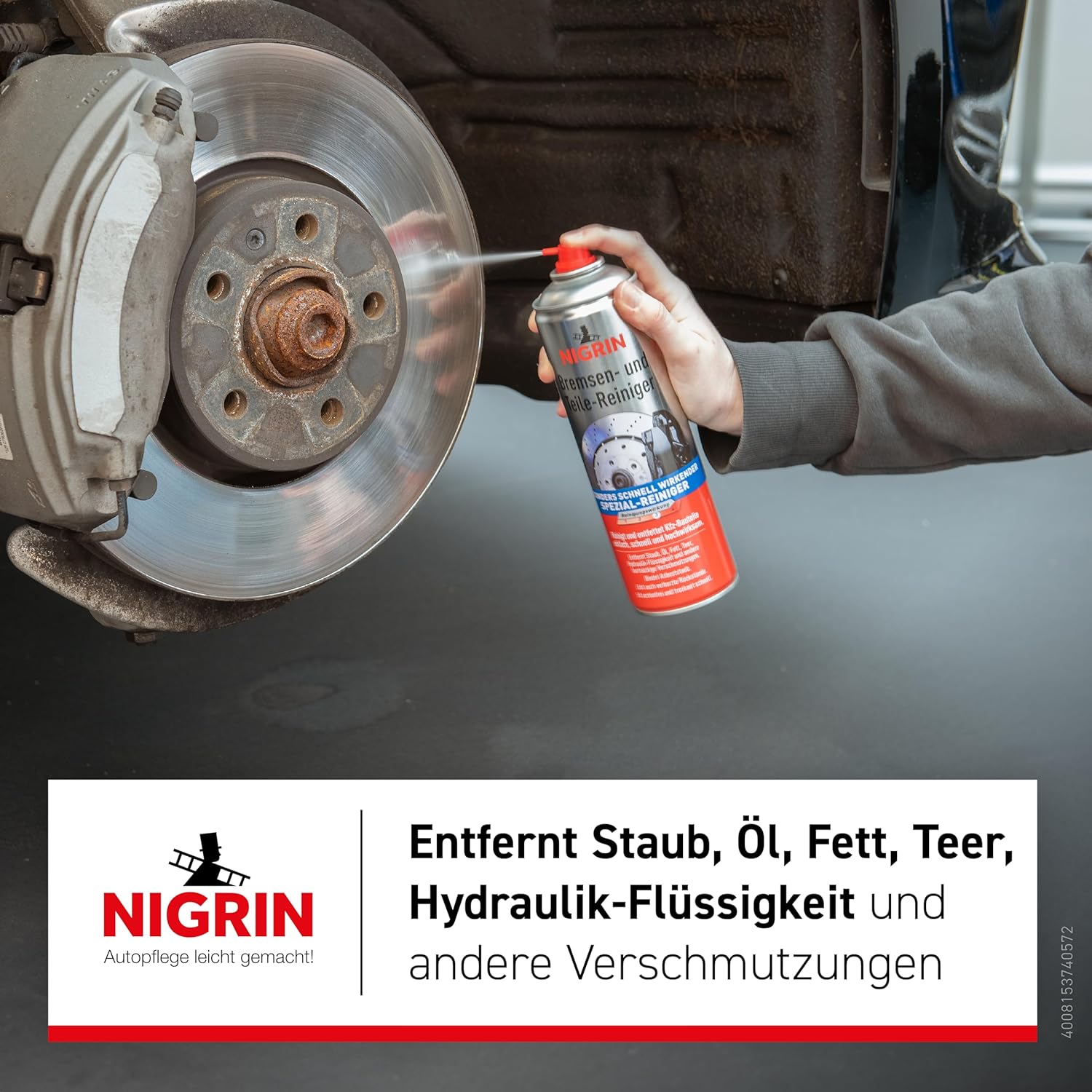 Der Nigrin Bremsenreiniger ist ein hochwirksamer und schnelltrocknender Reiniger, der zuverlässig Schmutz, Fett und Öl entfernt. Ideal für Bremsen, Motorenteile, Maschinen, Werkzeuge und Zweirad-Komponenten.