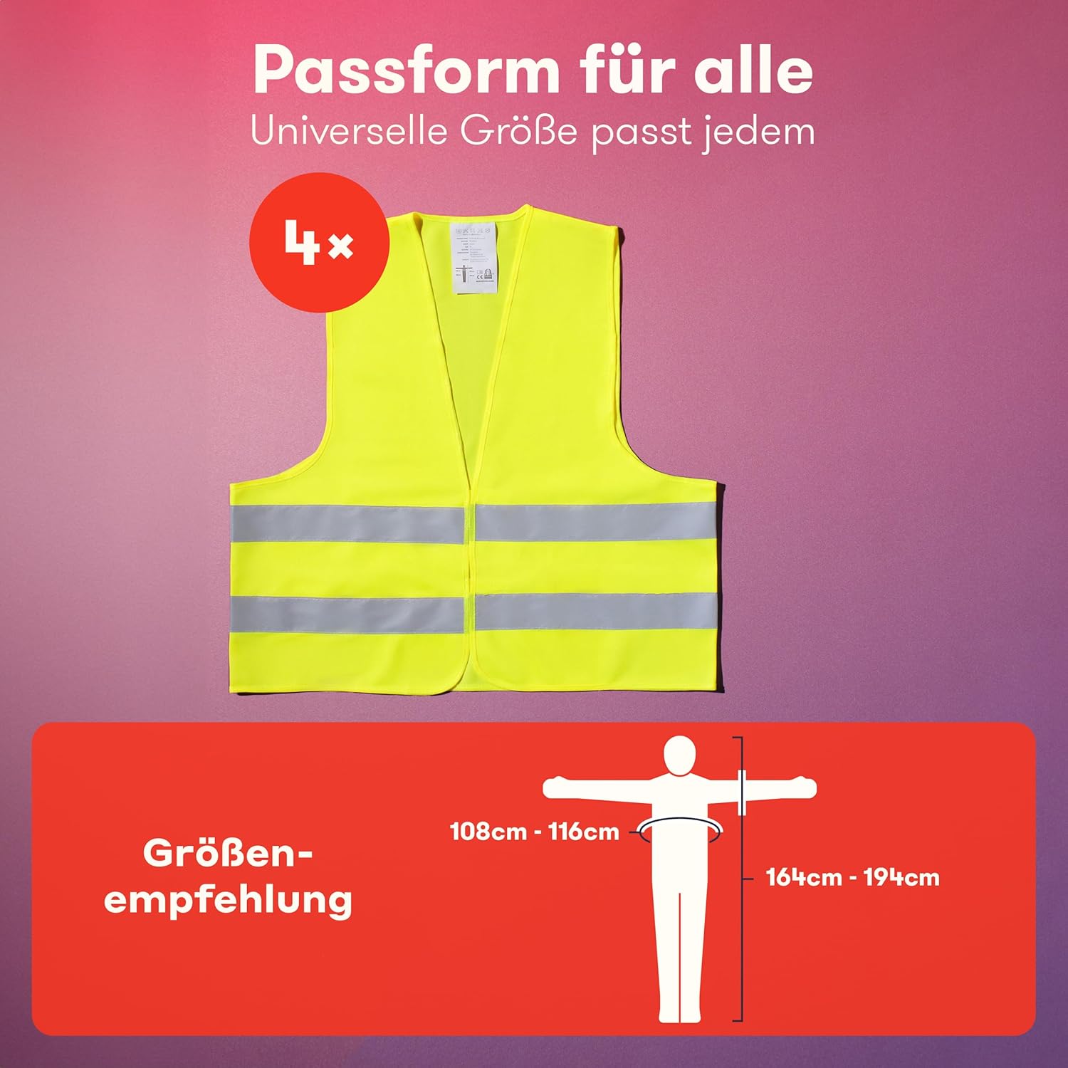 ✔️ Universelle Größe – Die Warnweste lässt sich dank der Klettverschlüsse individuell anpassen – auch für XXL-Größen geeignet.