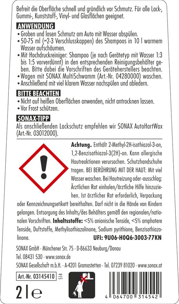 Das SONAX Autoshampoo Konzentrat reinigt Ihr Fahrzeug gründlich, ohne die schützende Wachs-Schicht auf dem Lack anzugreifen. Dank besonders sanfter Tenside wird der Lack optimal geschont, während Schmutz zuverlässig entfernt wird.