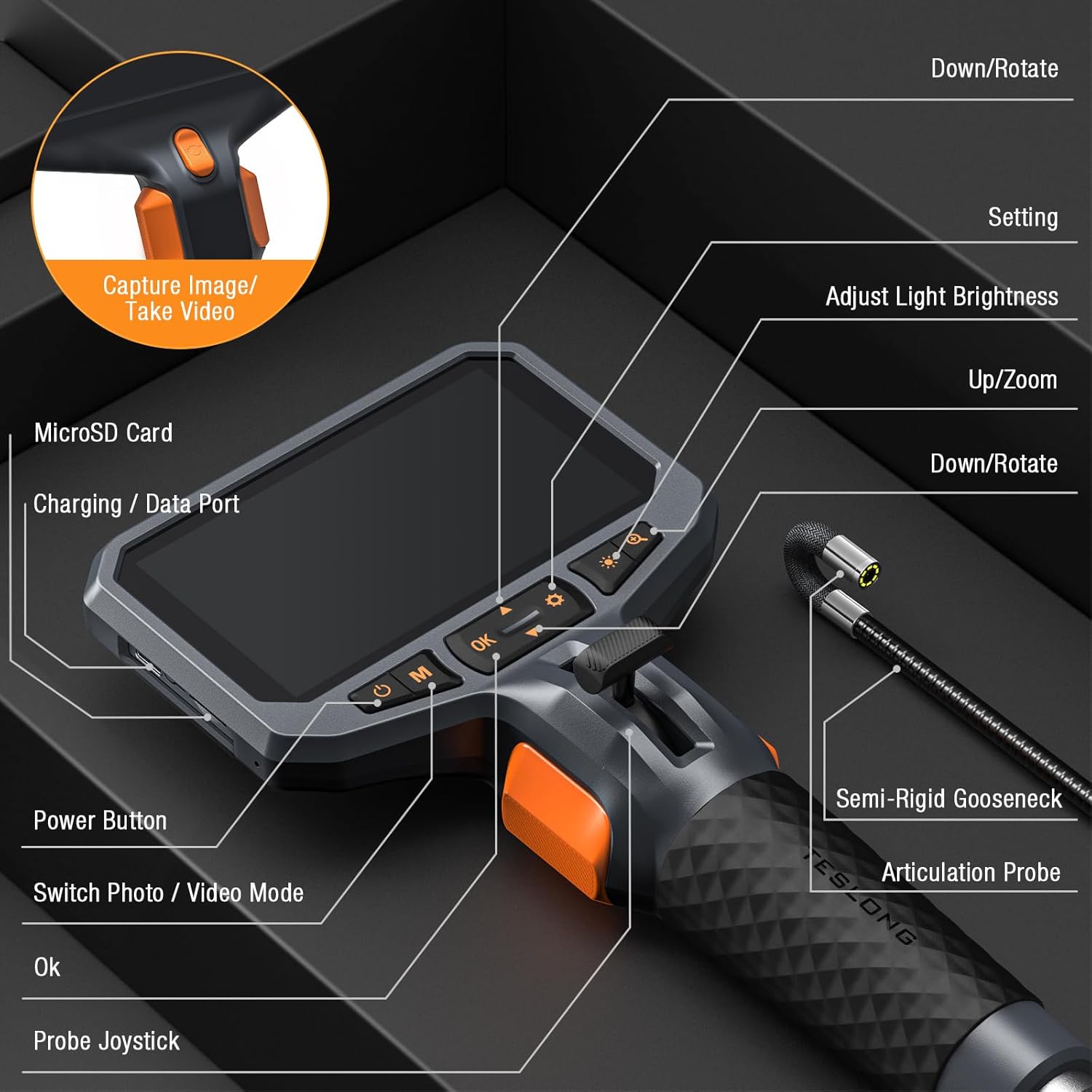 Die Teslong Endoskopkamera mit beweglichem Kopf erleichtert Inspektionen an schwer zugänglichen Stellen. Dank der flexiblen und steuerbaren Sonde navigieren Sie mühelos durch enge Bereiche – ob bei der Fahrzeugwartung oder in Haus & Werkstatt.
