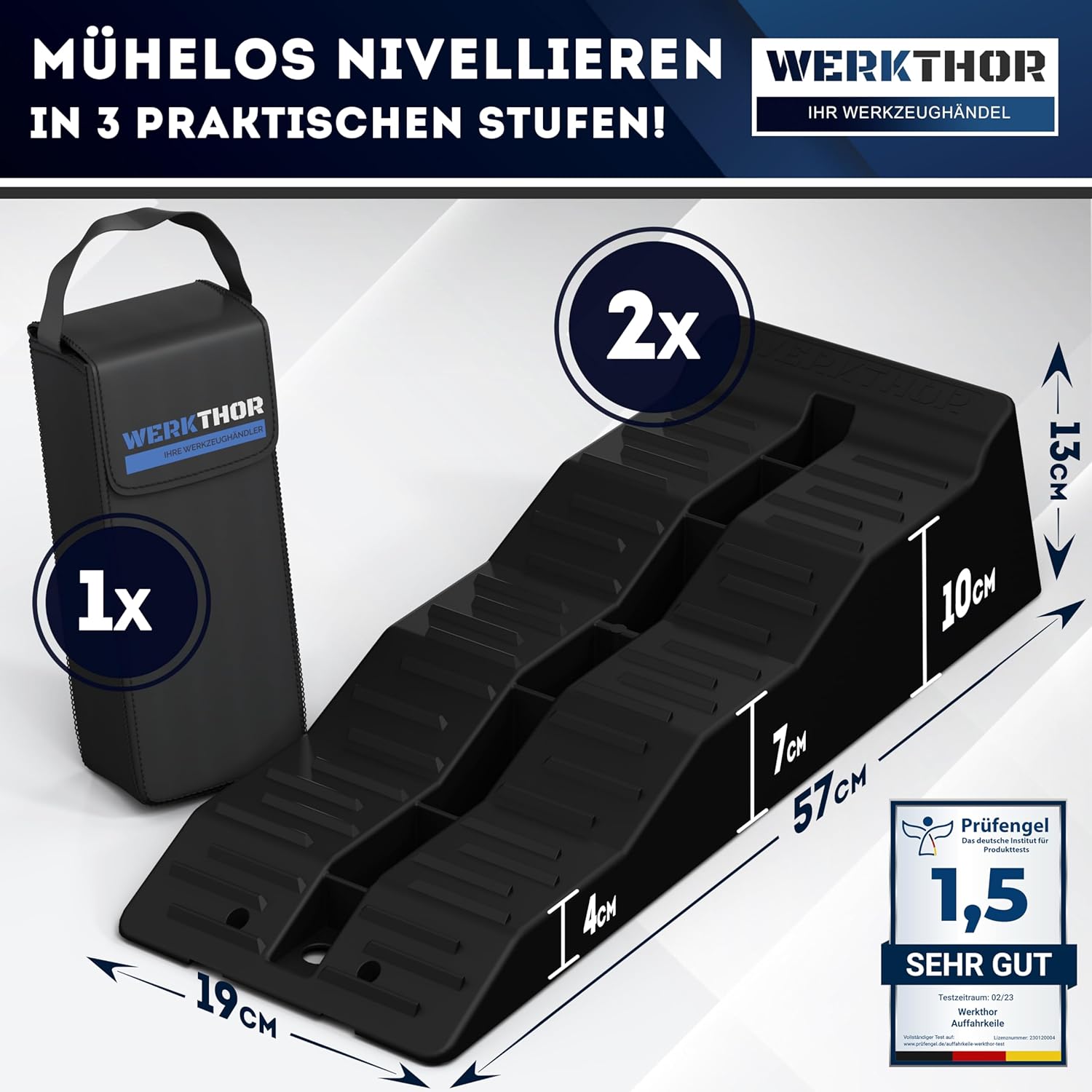 Die Auffahrkeile bieten drei verschiedene Höhenstufen, sodass Sie Ihr Fahrzeug flexibel und präzise ausrichten können. Das sorgt nicht nur für einen stabilen Stand, sondern schont auch Ihr Fahrwerk. Zudem wurden die Keile vom deutschen Institut für Produkttests mit „Sehr Gut“ bewertet, was ihre hohe Qualität eindrucksvoll bestätigt.
